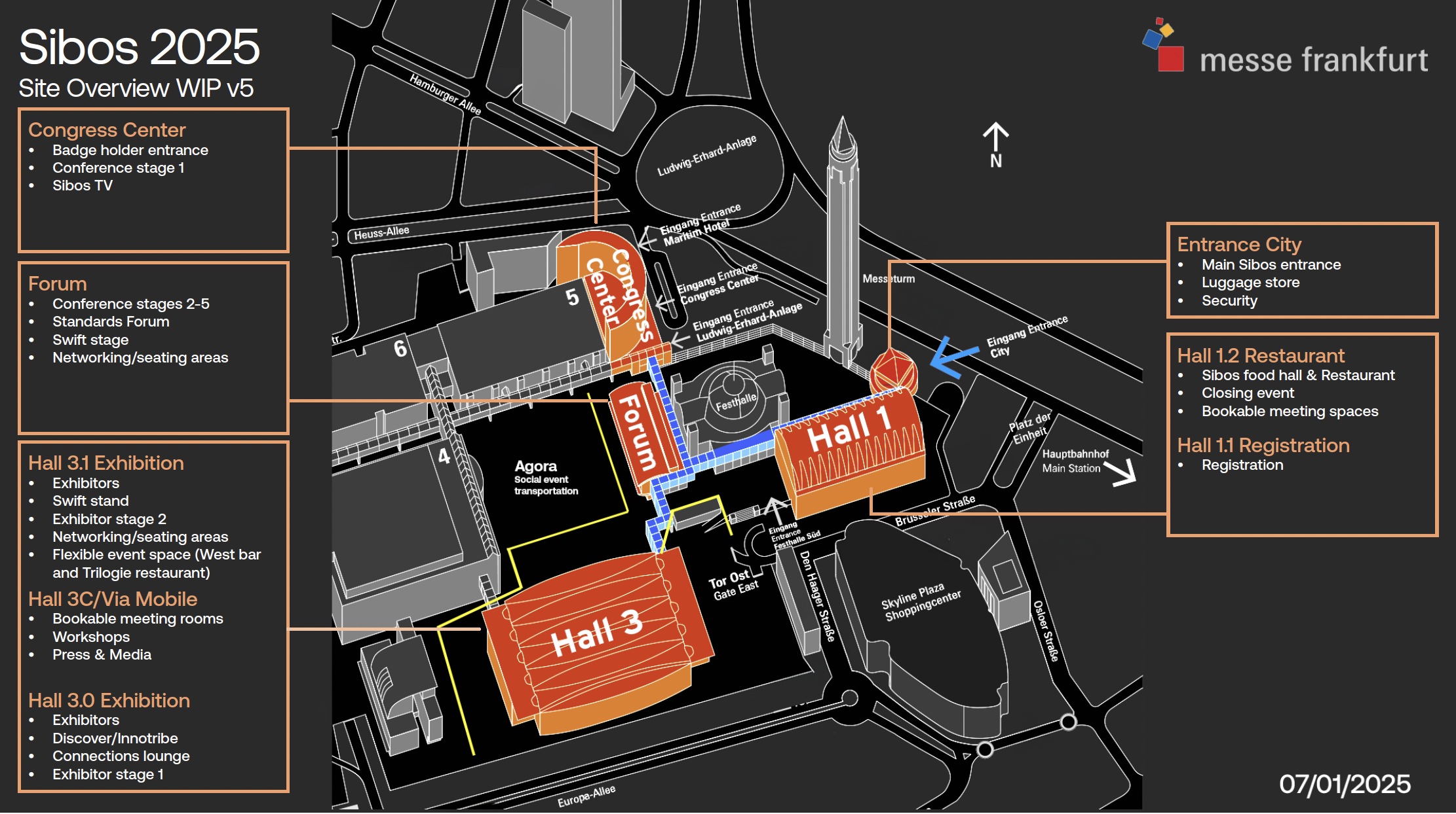Sibos will occupy part of the Messe Frankfurt complex, utilising space as follows: