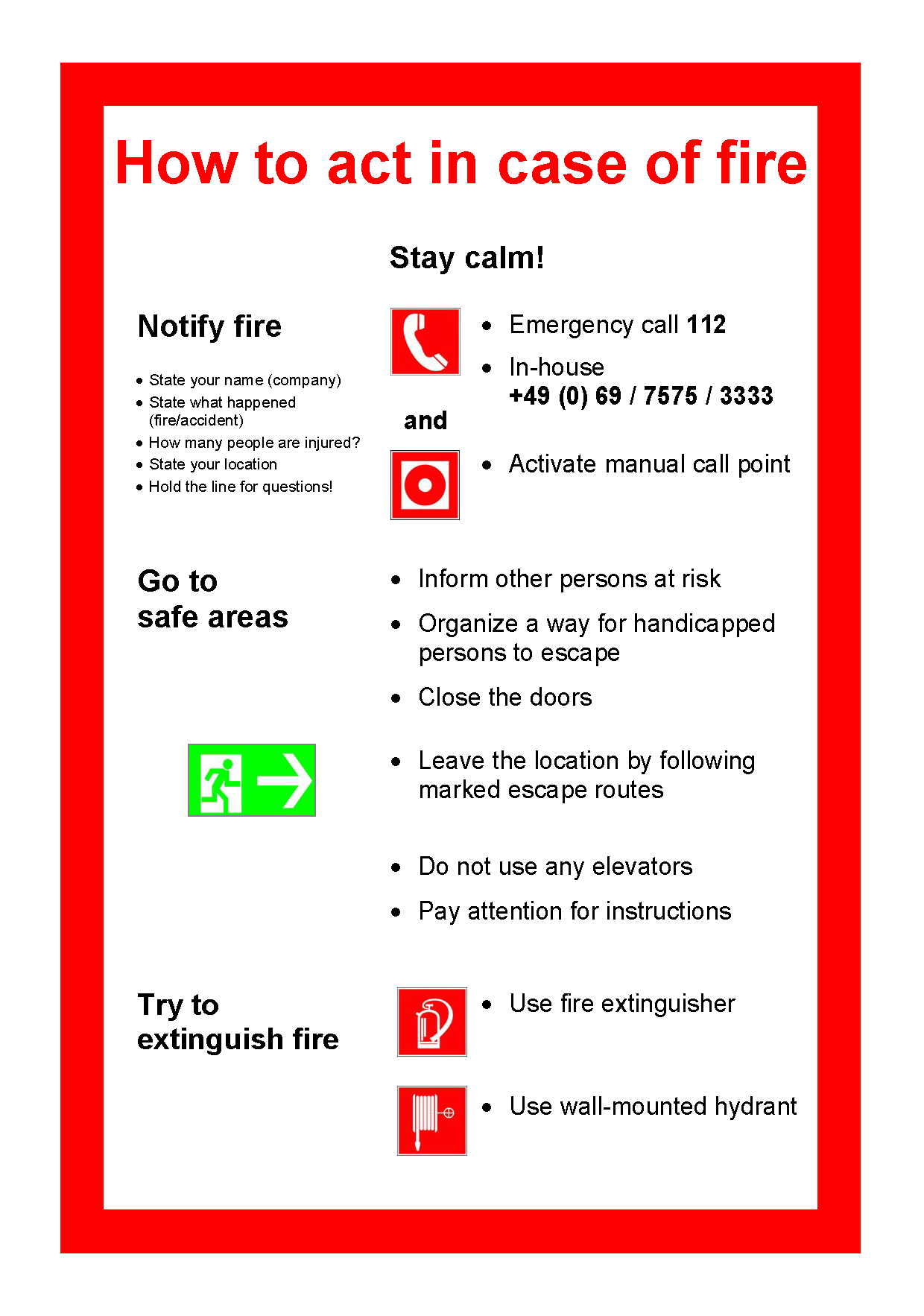 The evacuation alarm is issued in an announcement. This announcement is given in three languages (German, English, French) and runs in an endless loop until it is turned off (to be agreed). Evacuation alarm: